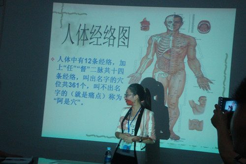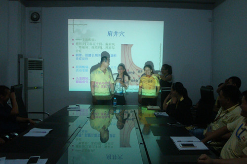 陳老師還現(xiàn)場向員工們傳授了穴位保健相關(guān)基礎(chǔ)知識和有效的預(yù)防及改善方法。通過真人模擬的方式,用電療儀等輔助治療器械幫助員工了解疏通穴位、測量血壓的操作方法。