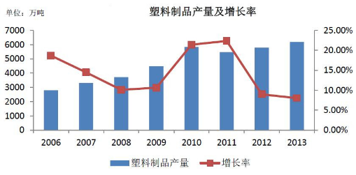 2013年我國(guó)塑料制品產(chǎn)量6,188.66萬噸,同比增長(zhǎng)8.02%;截至2014年12月,塑料制品規(guī)模以上企業(yè)14,062個(gè);完成主營(yíng)業(yè)務(wù)收入20,392.39億元,同比增長(zhǎng)8.92%;利潤(rùn)總額1,182.86億元,同比增長(zhǎng)4.24%;實(shí)現(xiàn)出口交貨值2,260.66億元,同比增加了2.82%。由此可見,塑料制品行業(yè)在我國(guó)的產(chǎn)業(yè)規(guī)模在不斷擴(kuò)大,其產(chǎn)量也逐年提高,同比增長(zhǎng)率近兩年有所放緩。