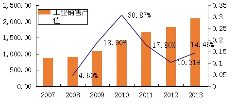 我國(guó)模具行業(yè)盡管起步較早,但初期一直作為下游生產(chǎn)企業(yè)的附屬企業(yè),模具商品流通率較低,限制了模具企業(yè)的發(fā)展。直至1987年, 模具才作為產(chǎn)品被列入機(jī)電產(chǎn)品目錄, 當(dāng)時(shí)全國(guó)共有生產(chǎn)模具的廠點(diǎn)約6,000家, 總產(chǎn)值約30億元。經(jīng)過20多年的發(fā)展, 中國(guó)的模具工業(yè)已有了長(zhǎng)足的進(jìn)步,截至2013年,企業(yè)數(shù)量達(dá)3萬家,年產(chǎn)值達(dá)2,200億元人民幣,年出口接近50億美元。目前,我國(guó)模具行業(yè)的最大市場(chǎng)是汽車行業(yè)、電子信息行業(yè)、家電和辦公設(shè)備、機(jī)械和建材行業(yè)。隨著我國(guó)國(guó)民經(jīng)濟(jì)的迅速發(fā)展,人民收入水平的提高,對(duì)汽車、電子消費(fèi)產(chǎn)品、家電等的需求不斷增加,使得這些行業(yè)近年來進(jìn)入一個(gè)高速發(fā)展的階段,成為我國(guó)模具行業(yè)迅速發(fā)展的一個(gè)重要原因。下圖為2007-2013年我國(guó)模具產(chǎn)值圖,可以看到,近年來我國(guó)模具行業(yè)產(chǎn)值增長(zhǎng)迅速,已經(jīng)從2007年的870億元增長(zhǎng)到2013年的2,106億元,增長(zhǎng)率遠(yuǎn)高于世界模具行業(yè)整體水平。