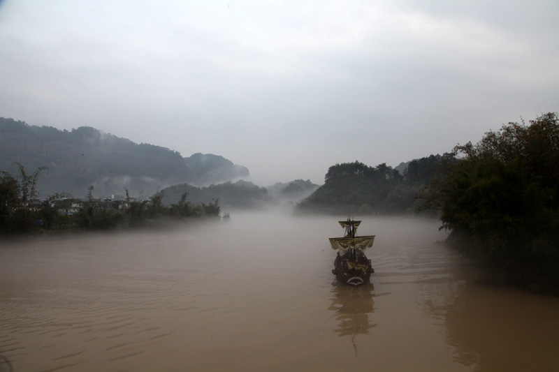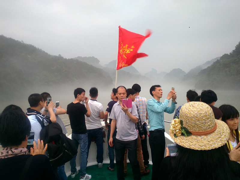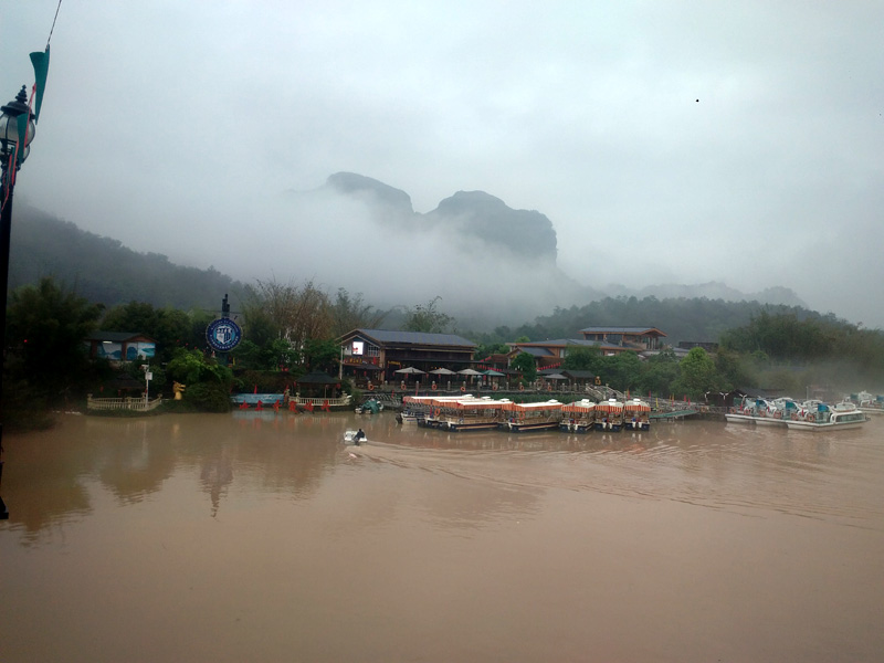 剛到丹霞山附近,就下起了瓢潑大雨,好像是老天有意要讓我們這些遠(yuǎn)道而來的游客先歇歇腳。沒辦法,只好在用過午餐后到預(yù)先訂好的旅館內(nèi)休息。約莫過了1小時(shí),雨終于停住了,團(tuán)隊(duì)終于可以出發(fā)了。我們步行來到景區(qū)門口,照張集體照顯然是很有必要的。在導(dǎo)游的帶領(lǐng)下,團(tuán)隊(duì)一行漫步來到了第二站:丹霞山的標(biāo)志性景區(qū)陽元山。一路游客并不多,主要聚集在拍攝區(qū)拍攝陽元石,然后原路返回。第三站:水上丹霞乘坐游船游錦江。人們常說“桂林山水甲天下,陽朔山水甲桂林”,我認(rèn)為錦江山水完全可以與漓江相媲美。我們登上游船,在船長的講解下,充分發(fā)揮大家的想象力,一路可以看到睡美人、群象出山,六指琴魔、拇指山、龜頭山、啤酒瓶山等自然景觀,每一景點(diǎn)無不形神相似。江兩岸的綠樹、紅巖、霧海、寺廟以及河流構(gòu)成了如夢如幻的人間仙境,真有種“舟行碧波上,人在畫中游”的感覺,充滿了詩情畫意。